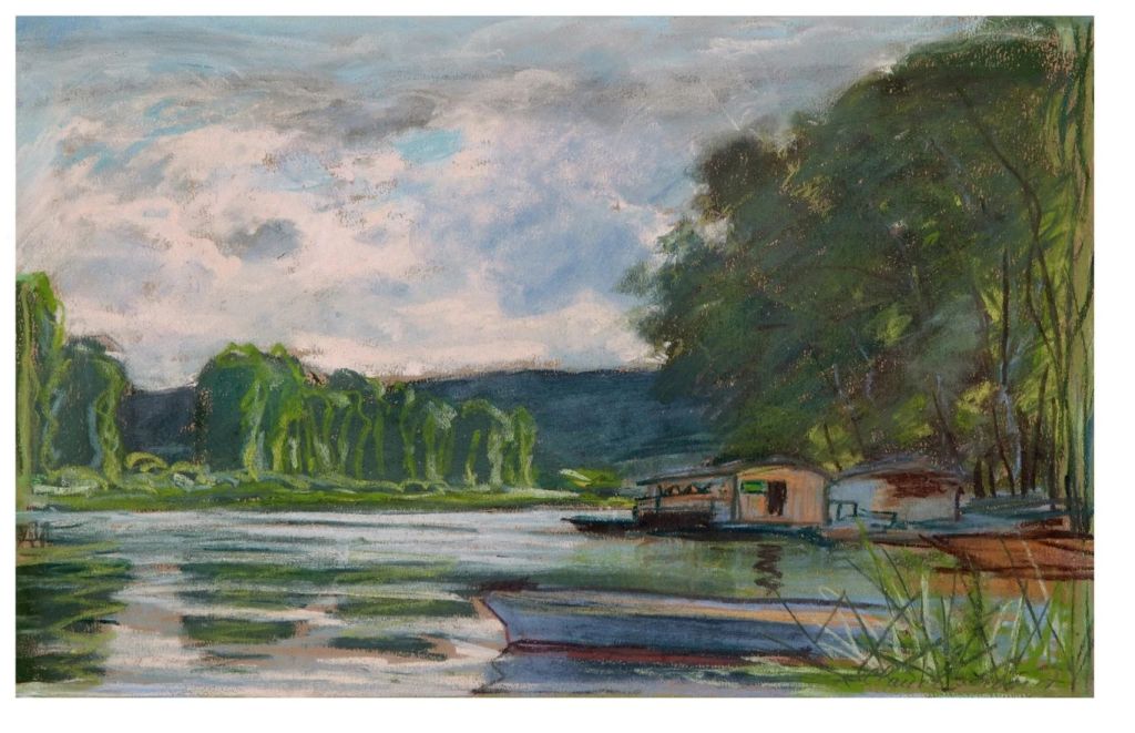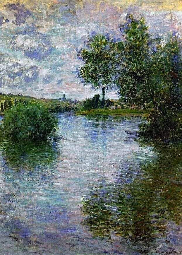 Claude Monet „Malurile râului Sena la Petit-Gennevilliers, apus de soare” (La berge du Petit-Gennevilliers, soleil Couchant), 1875 În această lucrare, Monet surprinde un moment efemer în care lumina serii se revarsă peste peisaj, unde lumina și culoarea sunt elemente fundamentale. Linia orizontului este situată în vârf, lăsând un câmp vizual larg care pătrunde în peisaj, ondulațiile blânde ale râului contrastează cu soliditatea vegetației din jur. În tablou, Monet folosește o paletă caldă pentru a evoca lumina serii; Tonurile portocalii și aurii se îmbină pe cer, reflectându-se ușor pe suprafața apei. Atingerile de verde și maro din vegetația din prim plan oferă echilibru, introducând în același timp un sentiment de realitate și tangibilitate în fundal Abordarea lui Monet asupra peisajului în această lucrare este în mod clar situată în cadrul mișcării impresioniste, care a căutat să surprindă natura în starea ei cea mai efemeră și mai schimbătoare.
