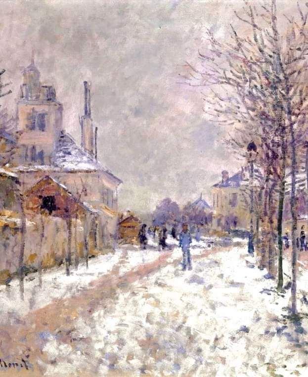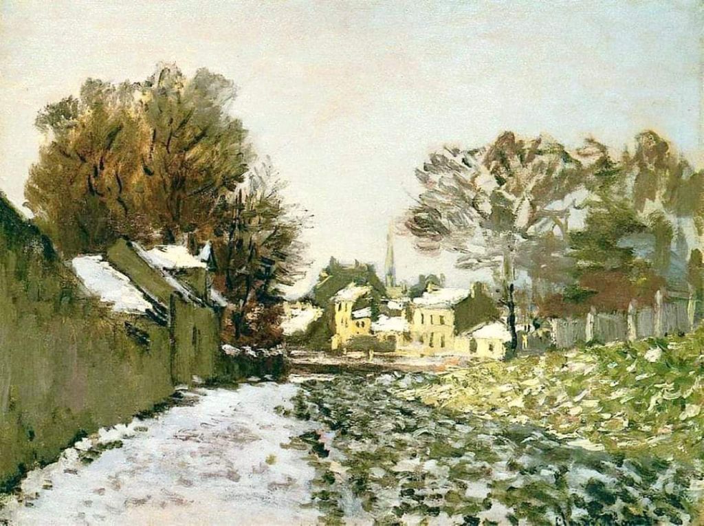 Surprinde o scenă de iarnă senină în orașul suburban Argenteuil, unde a locuit Monet la începutul anilor 1870. Pictura exemplifică stilul impresionist al lui Monet, cu pensulele sale moi și jocul subtil de lumini și umbre pe peisajul acoperit de zăpadă. Paleta discretă de alb, albastru și gri transmite atmosfera liniștită și rece a sezonului.