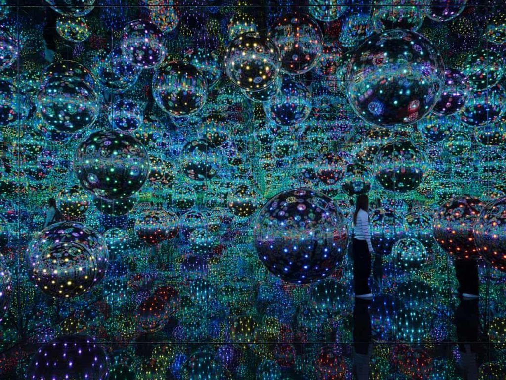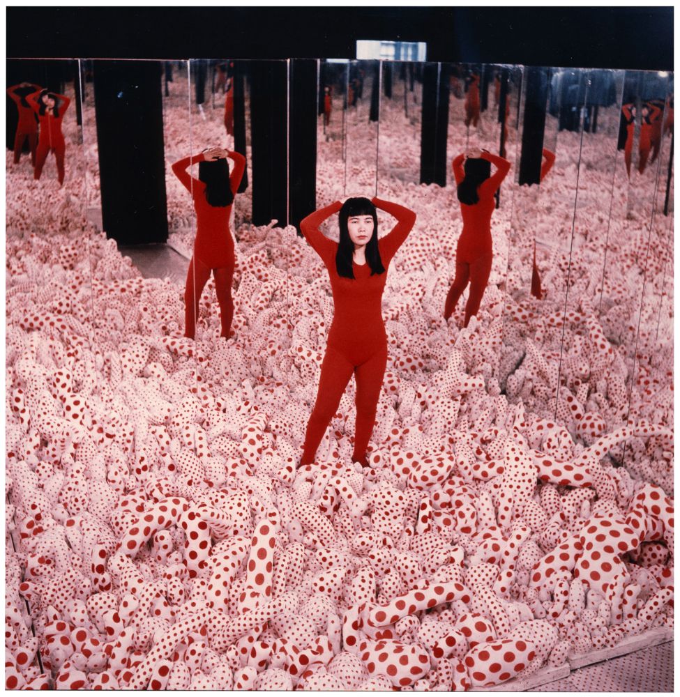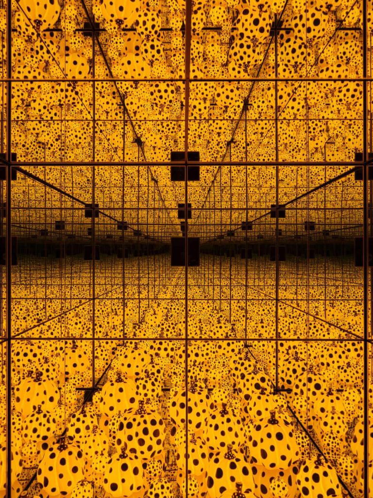 Instalația, pe care Kusama a prezentat-o pentru prima dată neoficial la Bienala de la Veneția din 1966, cuprinde 1.400 de bile de oțel inoxidabil, fiecare cu diametrul de 30 de centimetri, creând un peisaj care reflectă infinit. NGV încearcă să achiziționeze această lucrare prin apelul anual din 2024 (Smarthistory)