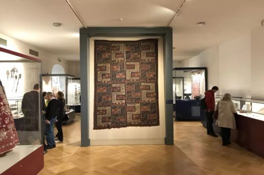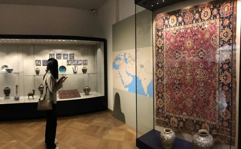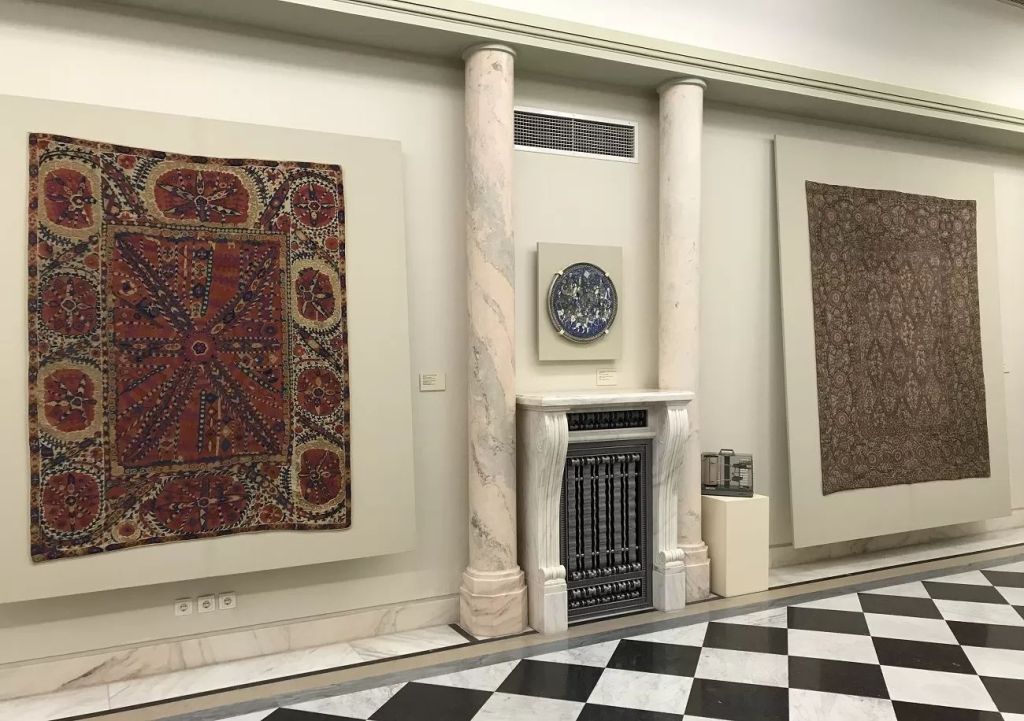 Suzani, sec. XIX, Asia Centrală, Buhara, și placă pentru masă, ceramică, sec. XIX, Iran, curatorial.roGaleria de Artă Orientală, curatorial.roCovor Isfahan, sec. XVII, centrul Iranului.Curatorial.ro