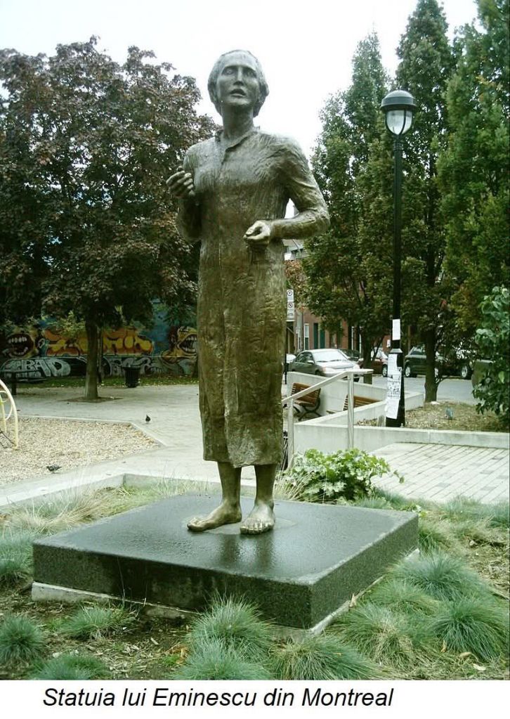 Este vorba despre statuia din „Piața România” din Montreal, a „Luceafărului poeziei românești – Mihail Eminescu” – reprezentat deplorabil, desculț, într-o lungă cămășoaie, probabil în ultimii săi ani de boală, la Socola… Cine a aprobat această blasfemie? Nu e de mirare că la inaugurarea ei, autoritățile române – președintele și ministrul culturii, au fost întâmpinați cu huidueli.[6]